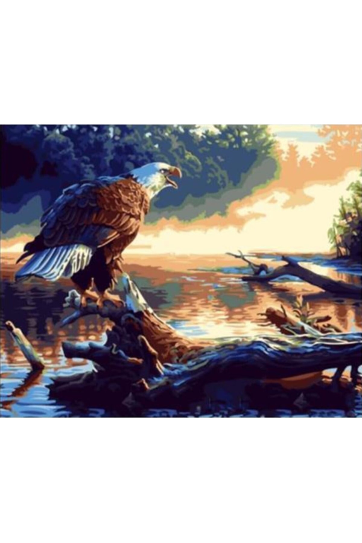 Göldeki Kartal Sayılarla Tablo Göldeki Kartal Sayılarla Tablo, hobi ürünümüzü kendi başınıza, ailenizden biriyle ve ya arkadaşlarınızla beraber ortaya çıkarabilirsiniz. Satın aldığınız Göldeki Kartal Sayılarla Tablomizin içinde; -40X50 cm boyutunda tuval şasesine gerilmiş tuval kanvası, -3 adet farklı boyutta fırçası (küçük, büyük, orta), -İhtiyacınız olacak tüm su bazlı akrilik boyaları, -Askı aparatı, -Kullanım kılavuzu