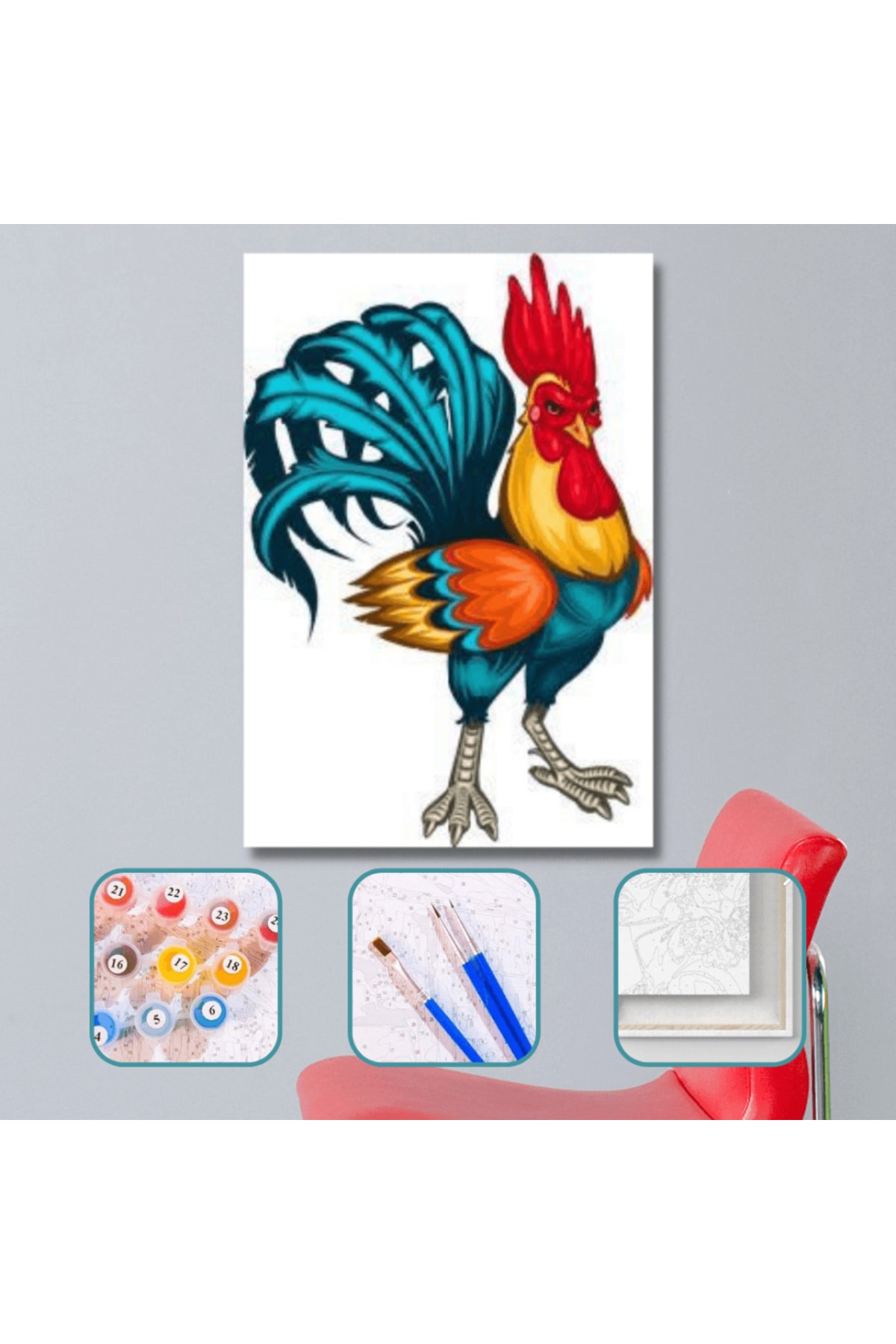 Renkli Horoz Boyama Seti 50x65cm Renkli Horoz Sayılarla Boyama Seti , hobi ürünümüzü kendi başınıza, ailenizden biriyle ve ya arkadaşlarınızla beraber ortaya çıkarabilirsiniz. Satın aldığınız Renkli Horoz Sayılarla Boyama Setinin içinde; -50x65cm boyutunda gerilmiş tuvalkanvası -3 adet farklı boyutta fırçası (küçük, büyük, orta), -İhtiyacınız olacak tüm su bazlı akrilik boyaları, -Kullanım kılavuzu, -Resmin ortaya çıktığında görünecek halinin küçük bir önizlemesi ile birlikte sizlere ücretsiz kargolanmaktadır.